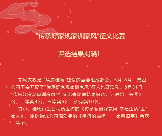 家风家教是 “清廉桂物”建设的重要组成部分。5月-8月,集团公司工会开展了“传承好家规家训家风”征文比赛活动。8月31日,“传承好家规家训家风”征文比赛评选结果揭晓,评选出一等奖2名,二等奖4名,三等...