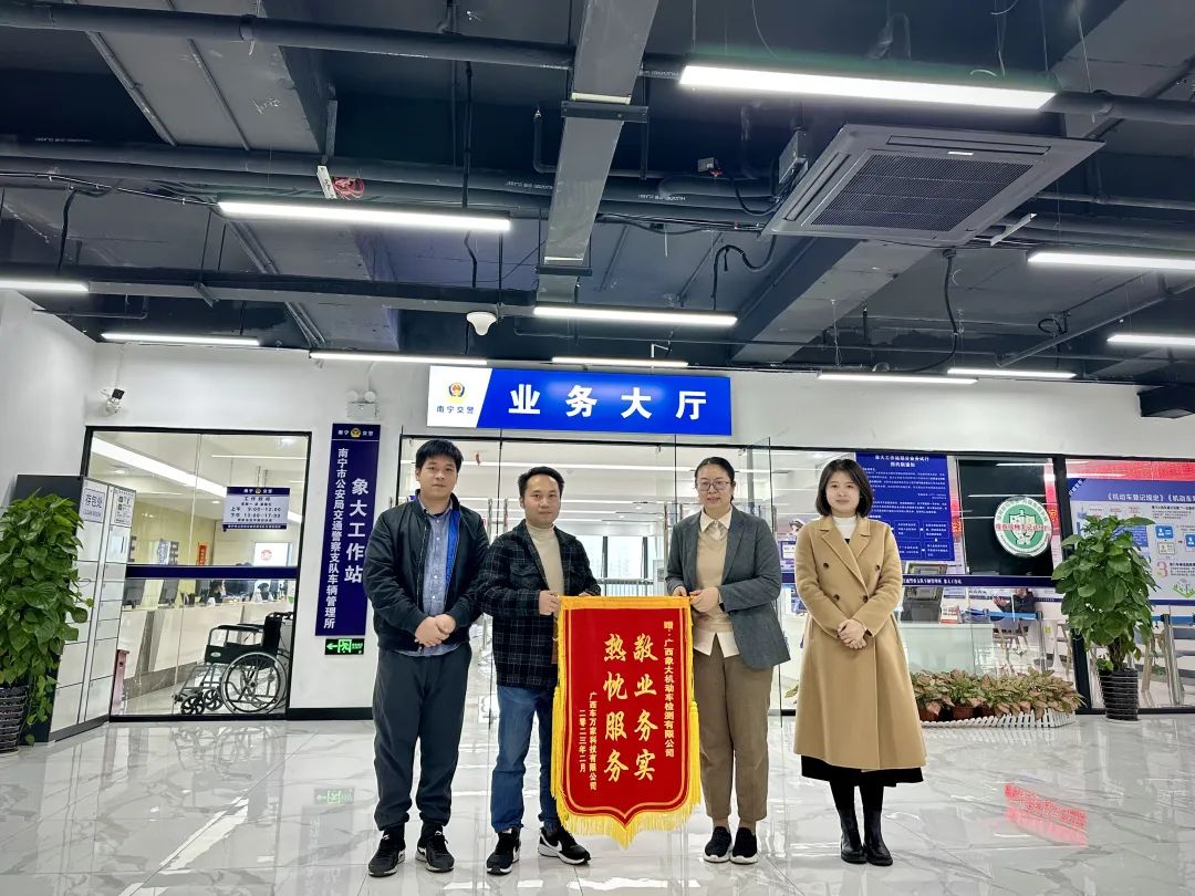 “真的非常谢谢你们,热情高效地帮助我们解决了100多辆新能源汽车注册登记难题,顺利获得国家补贴……”2月9日上午,机电集团象大公司车管工作站收到了广西车万家科技有限公司(以下简称“车万家”)送来的锦旗...